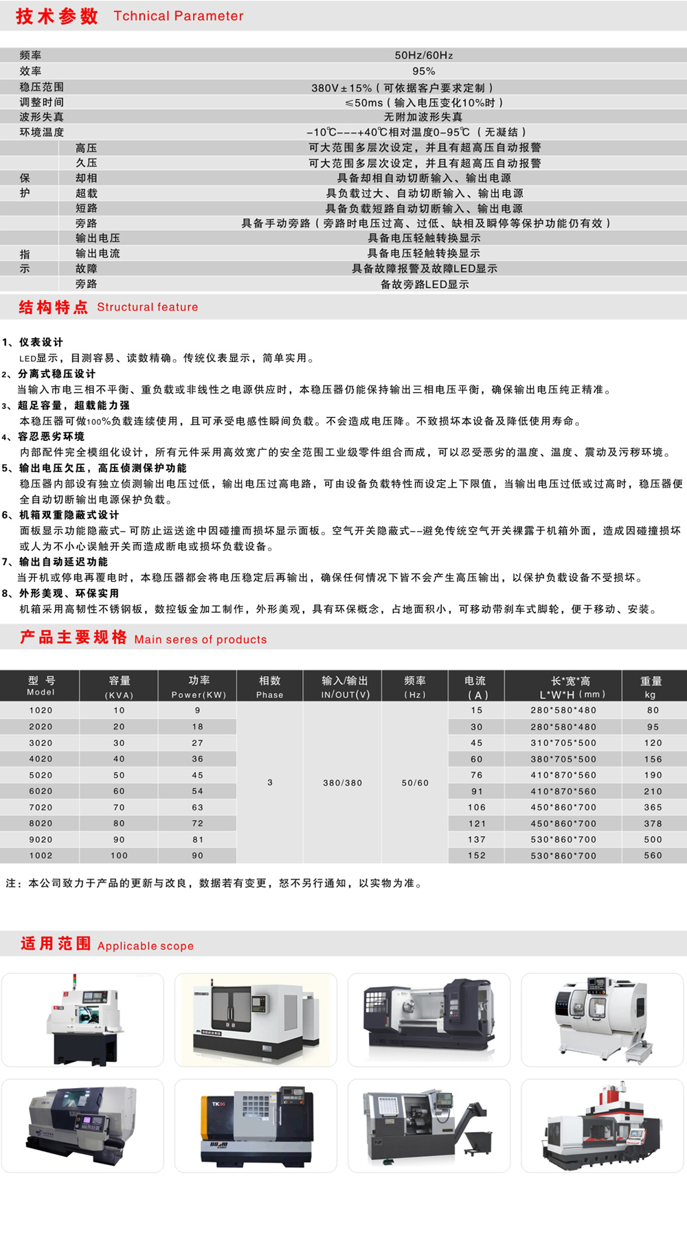 本穩(wěn)壓器是臺(tái)科的專利產(chǎn)品,以最專業(yè)的人才和領(lǐng)先的技術(shù)研發(fā)生產(chǎn)的一款工業(yè)級(jí)三相分調(diào)全自動(dòng)交流穩(wěn)壓器,以高貴新穎的工藝外 觀、穩(wěn)定可靠的設(shè)計(jì)原理、人性化的穩(wěn)壓系統(tǒng)和安裝面板、經(jīng)久耐用的品質(zhì),被企業(yè)家們廣泛運(yùn)用于進(jìn)口精密機(jī)械設(shè)備、紡織設(shè)備、醫(yī)療 設(shè)備、激光設(shè)備、木工設(shè)備、航空設(shè)備、印刷設(shè)備等。