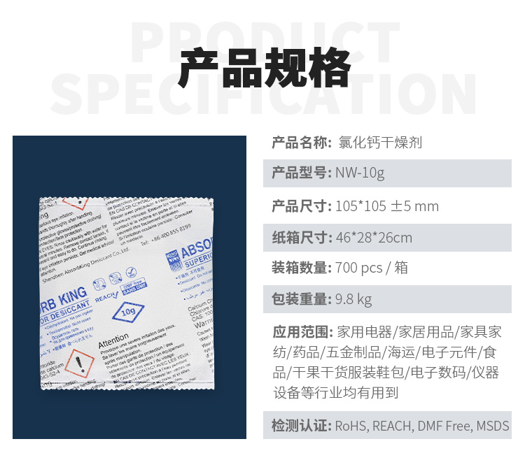 2、吸濕性強(qiáng),不滲漏。(氯化鈣干燥劑采用雙層包裝,內(nèi)層為美國(guó)TYVEK白色薄膜+PET塑料膜,外層為無(wú)紡布復(fù)合透氣膜,防止?jié)B漏。)
